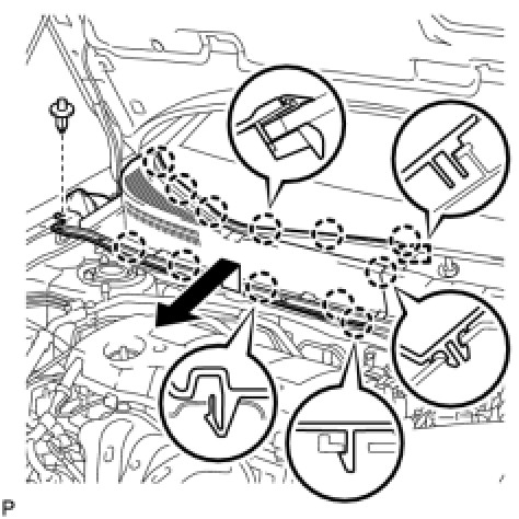 (b) Disengage the 7 clips and remove the hood to cowl top seal.