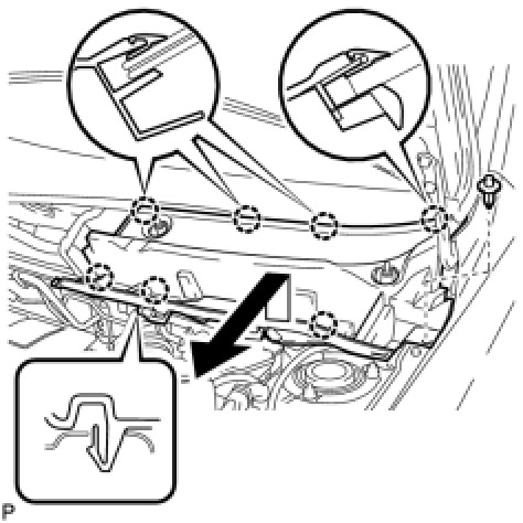 (b) Disengage the 12 claws and guide, and remove the cowl top ventilator louver RH as shown in the illustration.