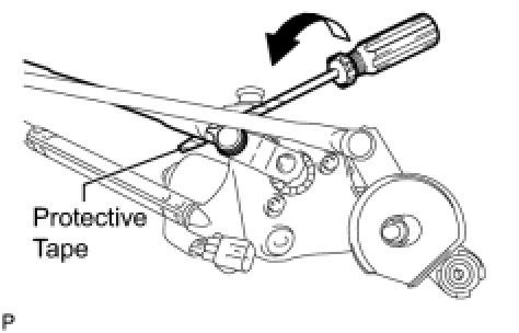 (a) Using a screwdriver with its tip wrapped with protective tape, disconnect the rod of the windshield wiper link assembly from the crank arm pivot of the windshield wiper motor assembly as shown in the illustration.