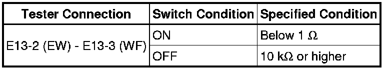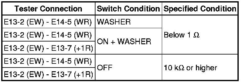 (4) Turn the washer switch ON and OFF, and check the voltage between terminals E14-3 (+1) and E13-2 (EW).
