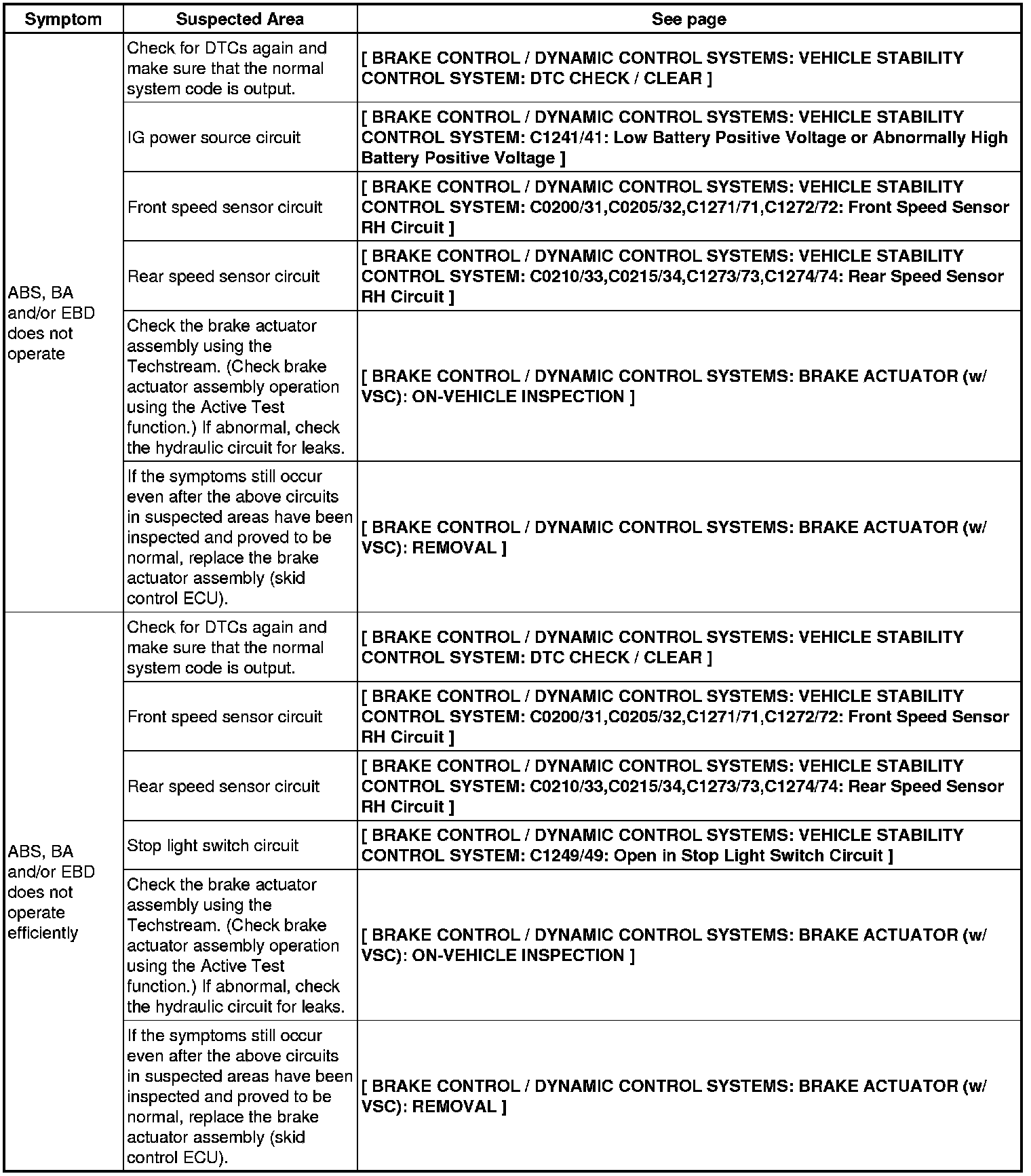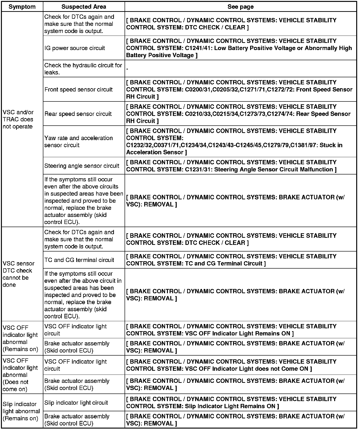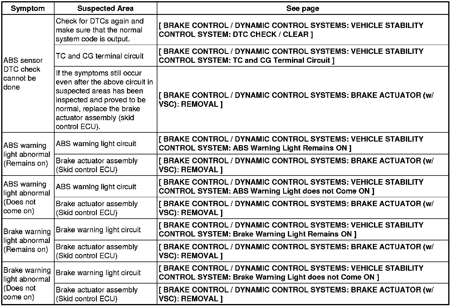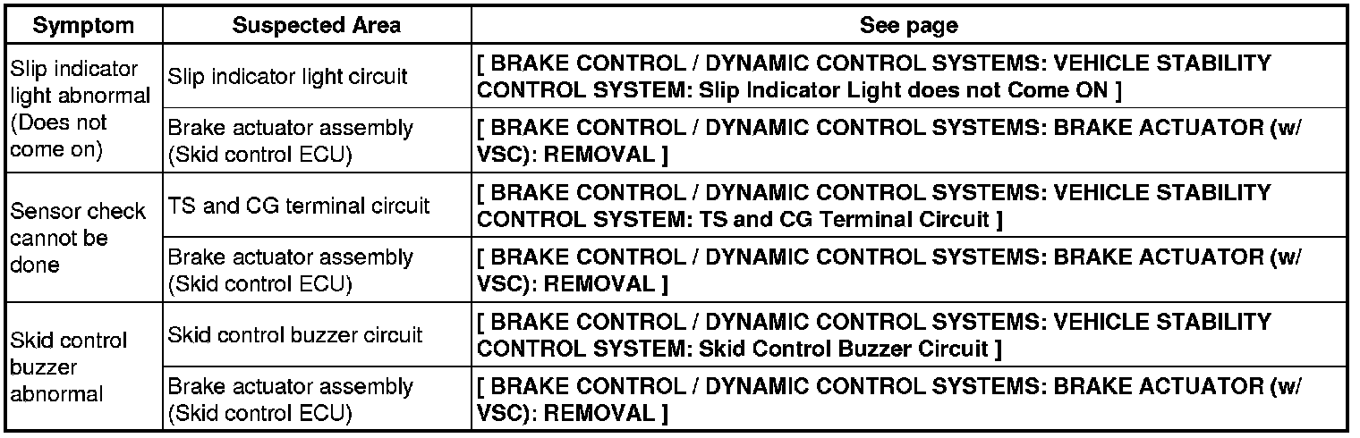 BRAKE CONTROL / DYNAMIC CONTROL SYSTEMS: VEHICLE STABILITY CONTROL SYSTEM (for 2AZ-FE): PROBLEM SYMPTOMS TABLE