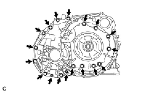 (c) Install the transaxle housing to the transaxle case and tighten the 18 bolts.