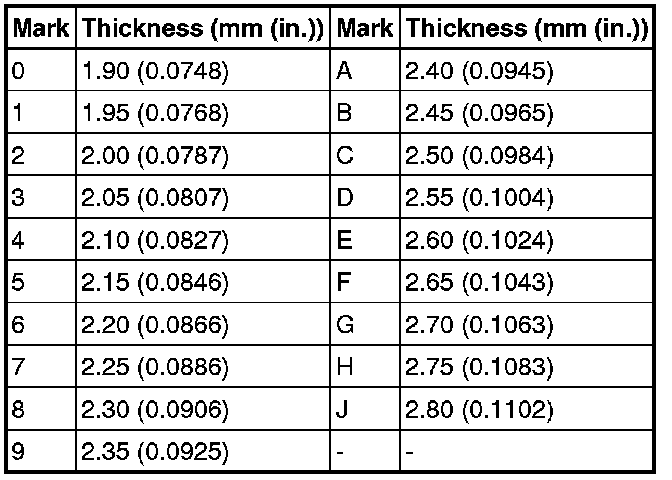 If the preload is not within the specified range, refer to the table below and select a thrust washer to adjust the preload to within the specified range.