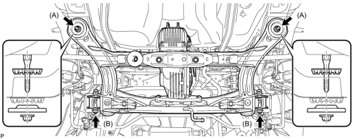 (c) Temporarily install the rear suspension member, 2 rear upper suspension member stoppers and rear lower suspension member stopper retainers with the 2 nuts (A), 2 nuts (B) and 2 bolts.