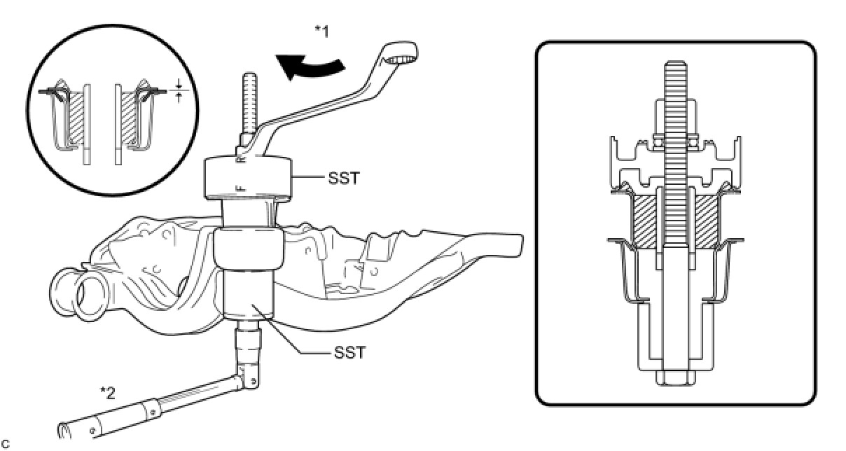 (b) Using SST, install the rear suspension member rear body mounting cushion until there is no clearance between the suspension member sub-assembly and the rear suspension member body mounting rear cushion.