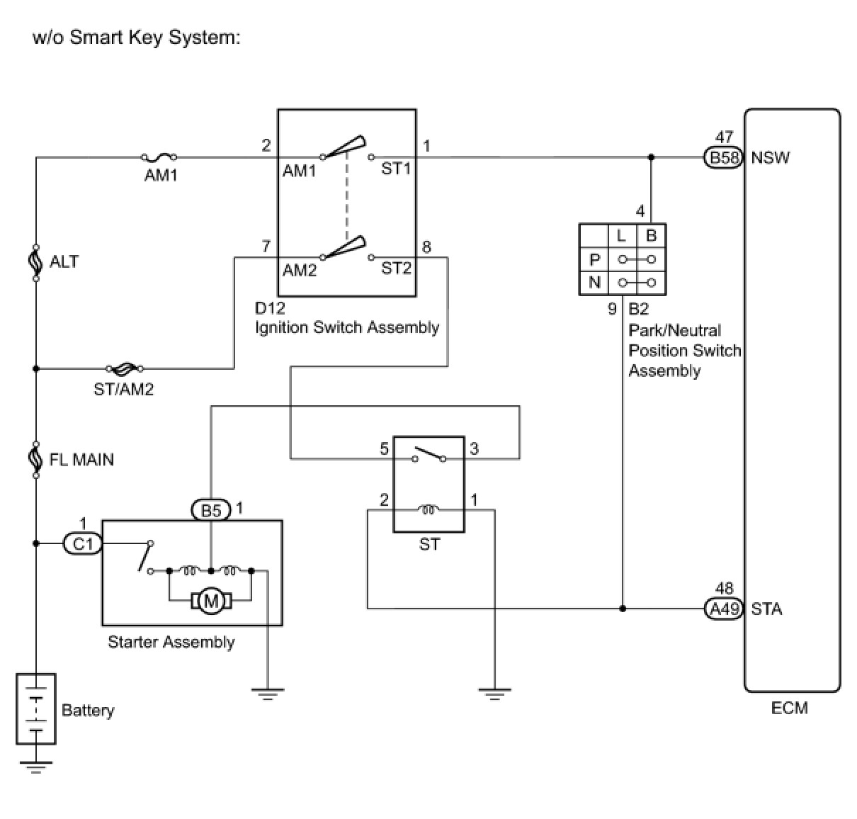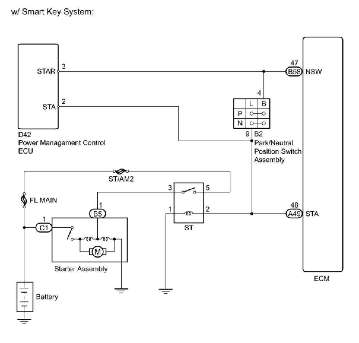 While the engine is being cranked, current flows from terminal STAR of the power management control ECU to the park/neutral position switch assembly and also flows to terminal STA of the ECM (STA signal).