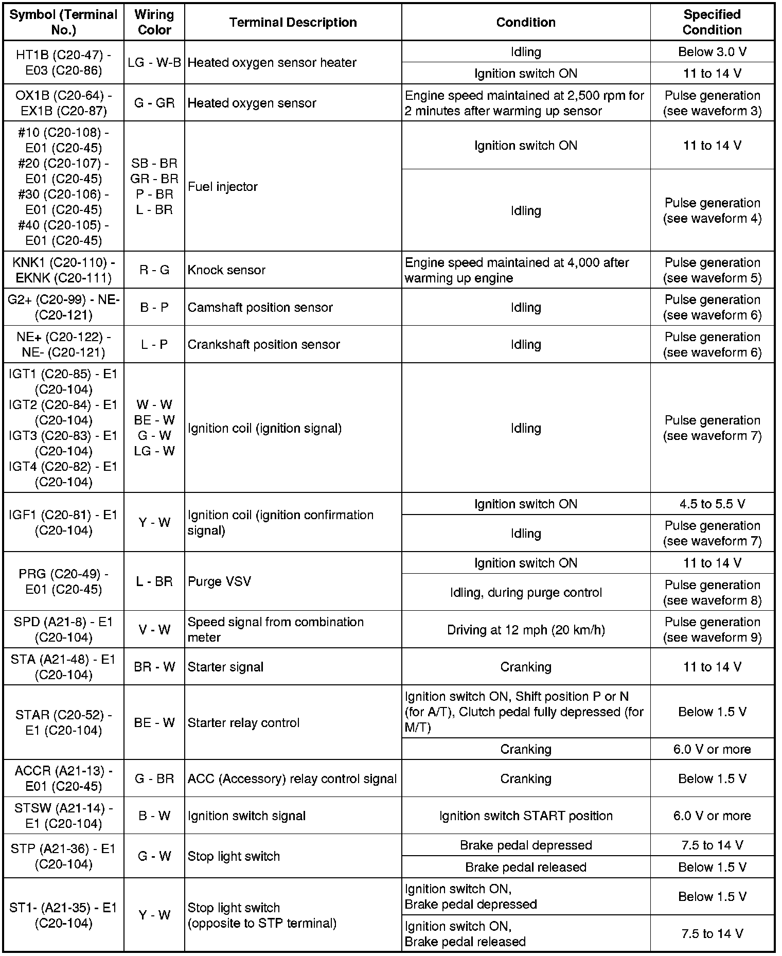 The standard normal voltage between each pair of ECM terminals is shown in the table below. The appropriate conditions for checking each pair of terminals are also indicated. The result of checks should be compared with the standard normal voltage for that pair of terminals, displayed in the Specified Condition column. The illustration above can be used as a reference to identify the ECM terminal locations.