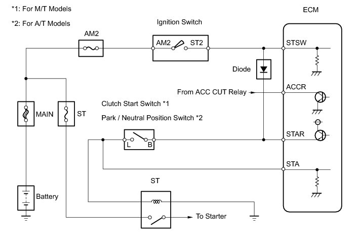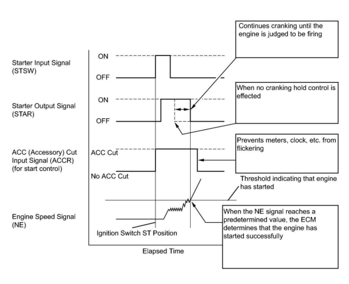The cranking holding control system provides a current to the starter when the ECM detects the ignition switch's start signal (STSW). When the ECM judges that the engine has started, the system cuts the current to the starter. When the ECM receives the STSW signal, it turns on the ACC (Accessory) relay, which prevents flickering of the combination meter, clock and audio system. Also, the ECM sends a signal to the ECM's STAR terminal. Then the STAR output signal travels through the Park/Neutral Position (PNP) switch to the ST relay, causing the starter to activate. When the engine is cranking, the starter operation signal is sent to the ECM's STA terminal.