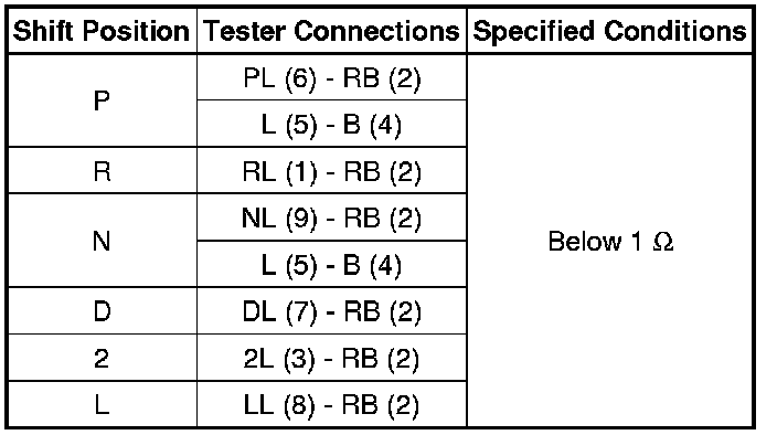 (b) Check the resistance between each terminal shown below when the shift lever is moved to each range.