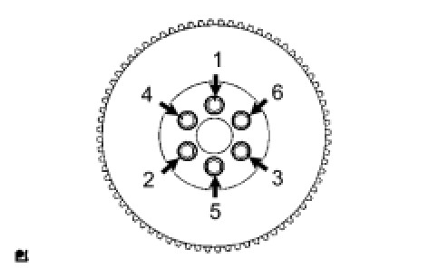 FLYWHEEL SUB-ASSEMBLY (for Manual Transaxle)Install the flywheel with the 6 bolts in the order shown in the illustration.
