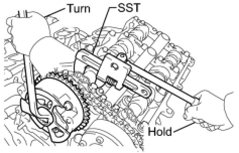 (d) Using SST to hold the hexagonal portion of each camshaft, tighten the flange bolts of the camshaft timing gear assembly and the camshaft timing exhaust gear assembly LH.