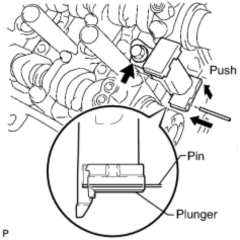 (b) While pushing in the tensioner, insert a pin of dia 1.0 mm (0.039 in.) into the hole to fix it.
