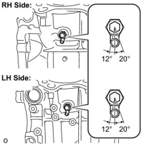 * When installing the camshaft housing LH, it is necessary to correctly position the camshafts as shown in the illustration. Failure to correctly position these parts may result in damage due to contact between the pistons and valves. If a camshaft is rotated with a piston at TDC, valve contact will occur.