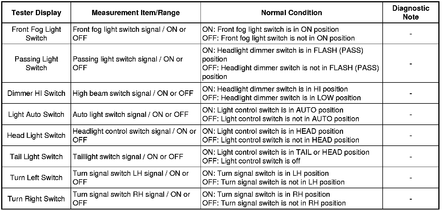 (d) Enter the following menus: Body Electrical / Combination Switch / Data List.