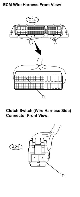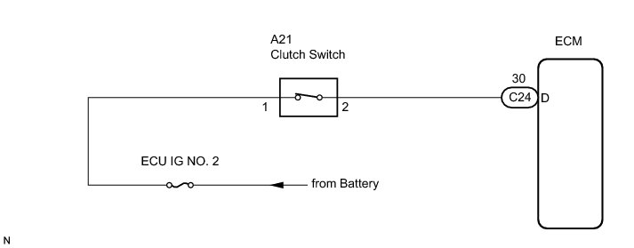 When the clutch pedal is released, the ECM receives positive (+) battery voltage through the ECU IG NO. 2 fuse. While depressing the clutch pedal, the clutch switch sends a signal to terminal D of the ECM. The ECM cancels cruise control drive when terminal D receives the signal.