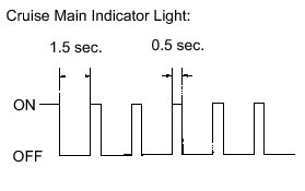 While driving with cruise control, the ECM activates AUTO CANCEL of the cruise control system when a malfunction occurs in one of the following: vehicle speed sensors, stop light switch, or other related parts. When AUTO CANCEL is activated, the cruise main indicator light outputs the blinking pattern shown to the left. At the same time, data of the malfunction is stored as a DTC.