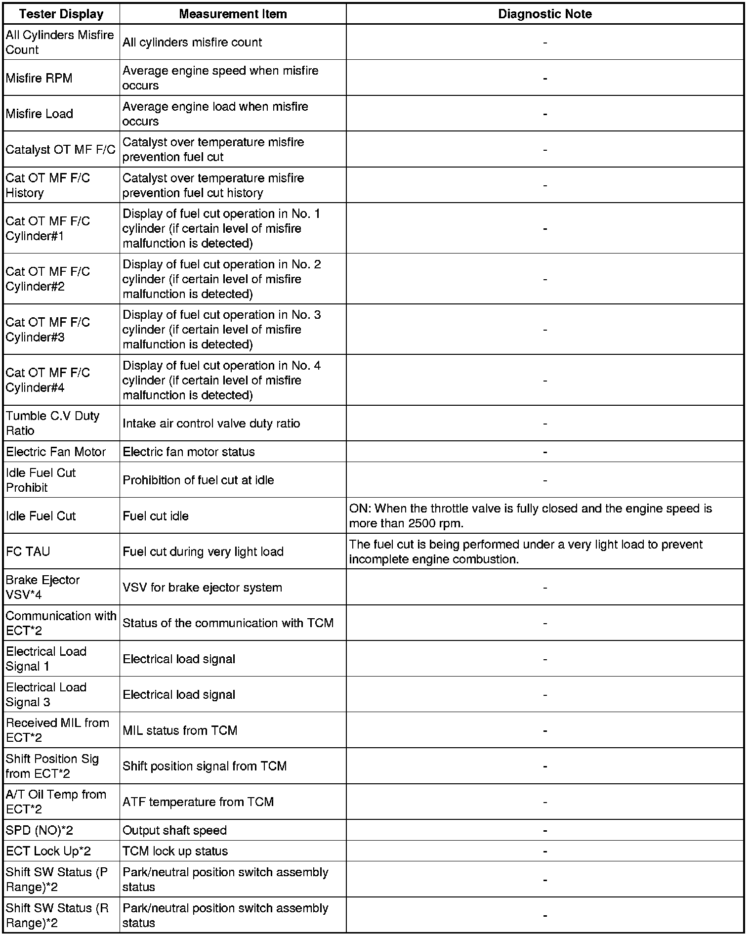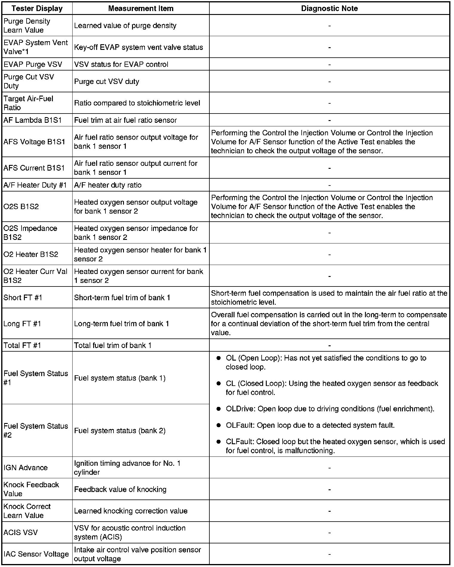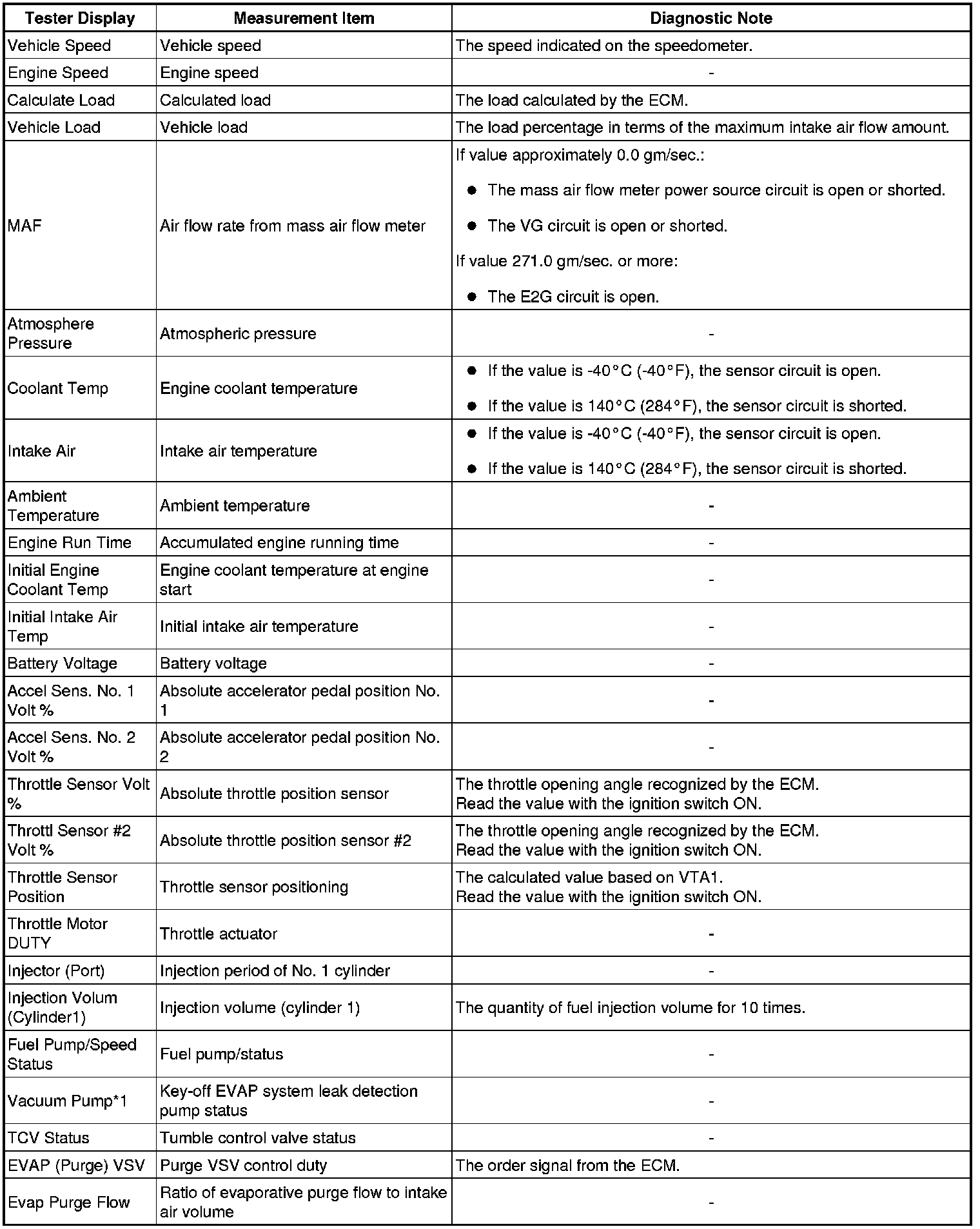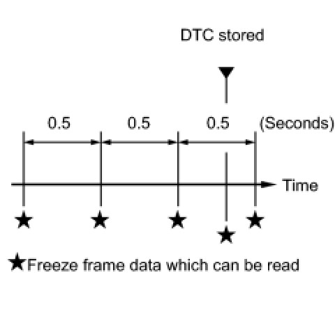 * The ECM records vehicle and driving condition information as freeze frame data the moment a DTC is stored. When troubleshooting, freeze frame data can be helpful in determining whether the vehicle was moving or stationary, whether the engine was warmed up or not, whether the air-fuel ratio was lean or rich, as well as other data recorded at the time of a malfunction.
