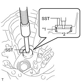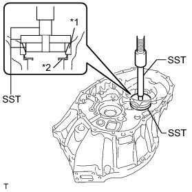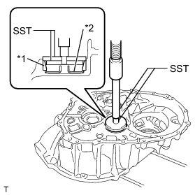 (c) Using SST and a press, press in the front differential case front tapered roller bearing (outer race) to the front transaxle case.