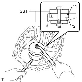 (d) Using SST and a torque wrench, turn the differential case assembly clockwise and counterclockwise 2 or 3 times to allow the bearings to settle.