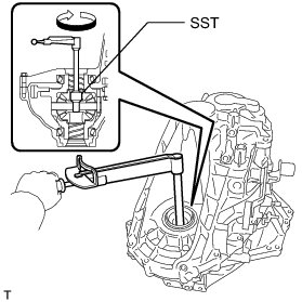 (e) Using SST and a torque wrench, measure the preload (value A). Calculate the rear output shaft bearing shim value using the following formula.