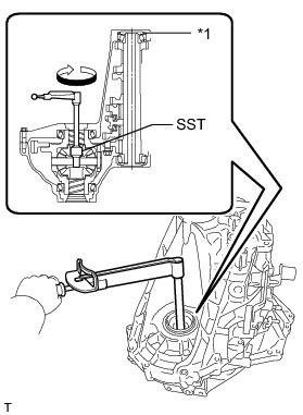 (c) Using SST and a torque wrench, turn the differential case assembly clockwise and counterclockwise 2 or 3 times to allow the bearings to settle.
