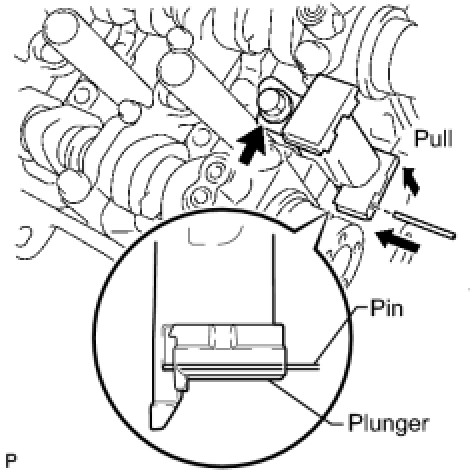 (b) While pulling up the tensioner, insert a pin of dia1.0 mm (0.039 in.) into the hole to secure it.
