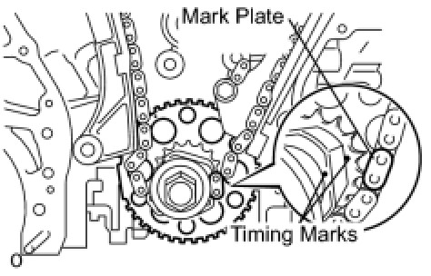 (d) Align the mark plate and timing marks as shown in the illustration and install the chain onto the crankshaft timing sprocket.