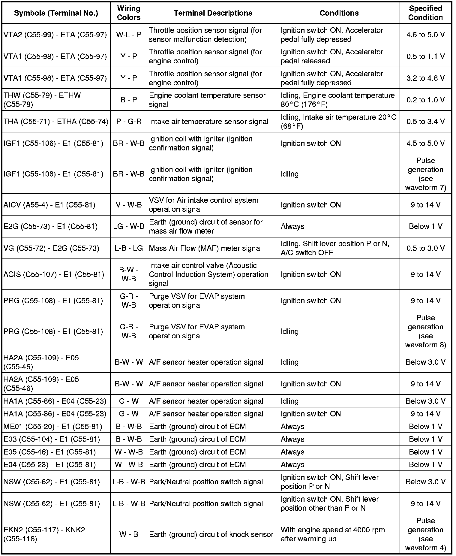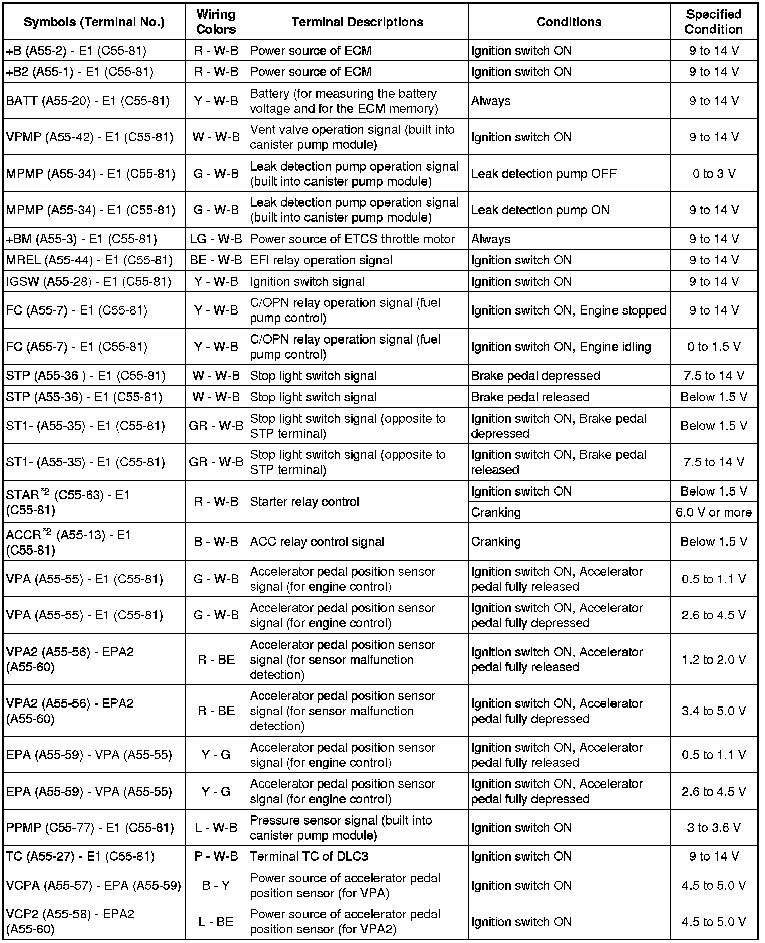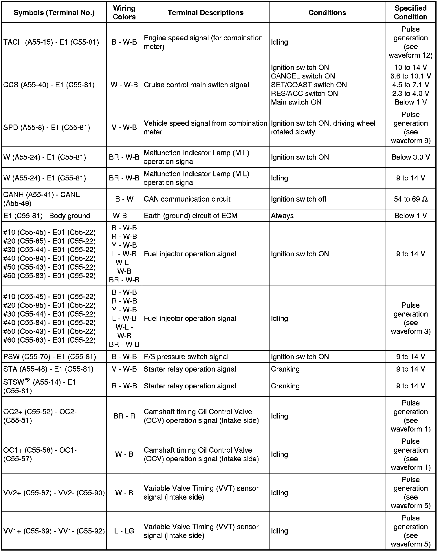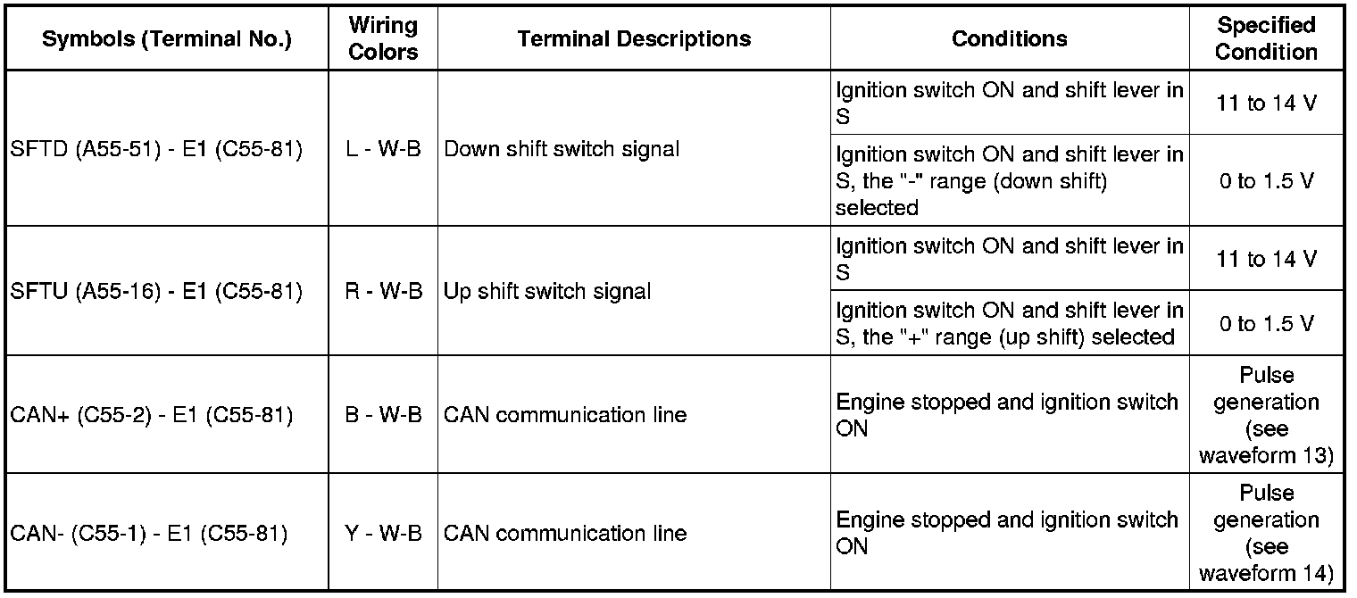 The standard normal voltage between each pair of the ECM terminals is shown in the table below. The appropriate conditions for checking each pair of the terminals are also indicated.