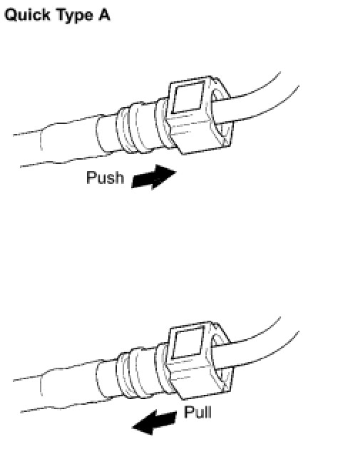 (2) Line up the two parts of the pipes to be connected, and push them together until the connector makes a "click" sound. If the pipe is difficult to push into the connector, apply a small amount of clean engine oil to the tip of the pipe and reinsert it.