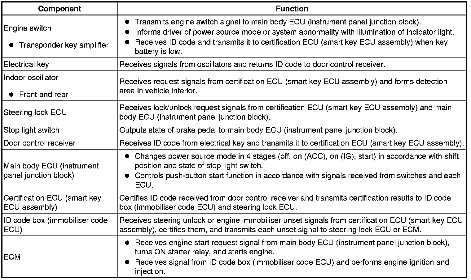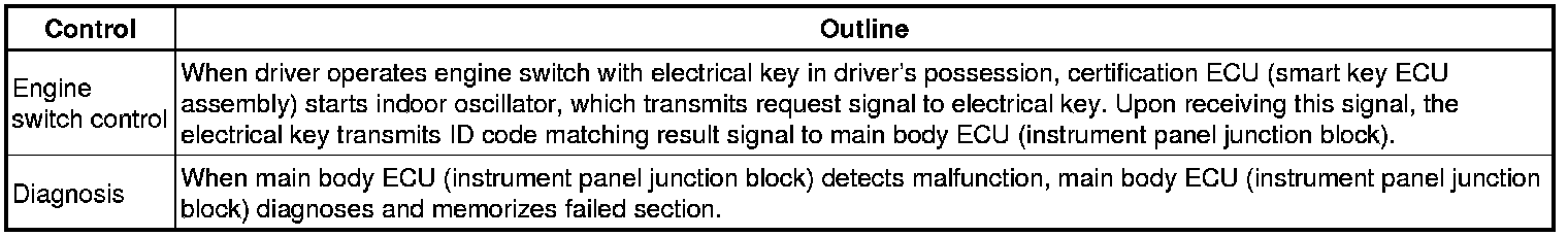 (a) The push-button start function uses a push-type engine switch, which the driver can operate by merely carrying the electrical key. This system consists primarily of the main body ECU (instrument panel junction block), engine switch, ID code box (immobiliser code ECU), steering lock ECU, electrical key, ACC relay, IG1 relay, IG2 relay and certification ECU (smart key ECU assembly). The main body ECU (instrument panel junction block) controls the function. This function operates in cooperation with the smart key system.
