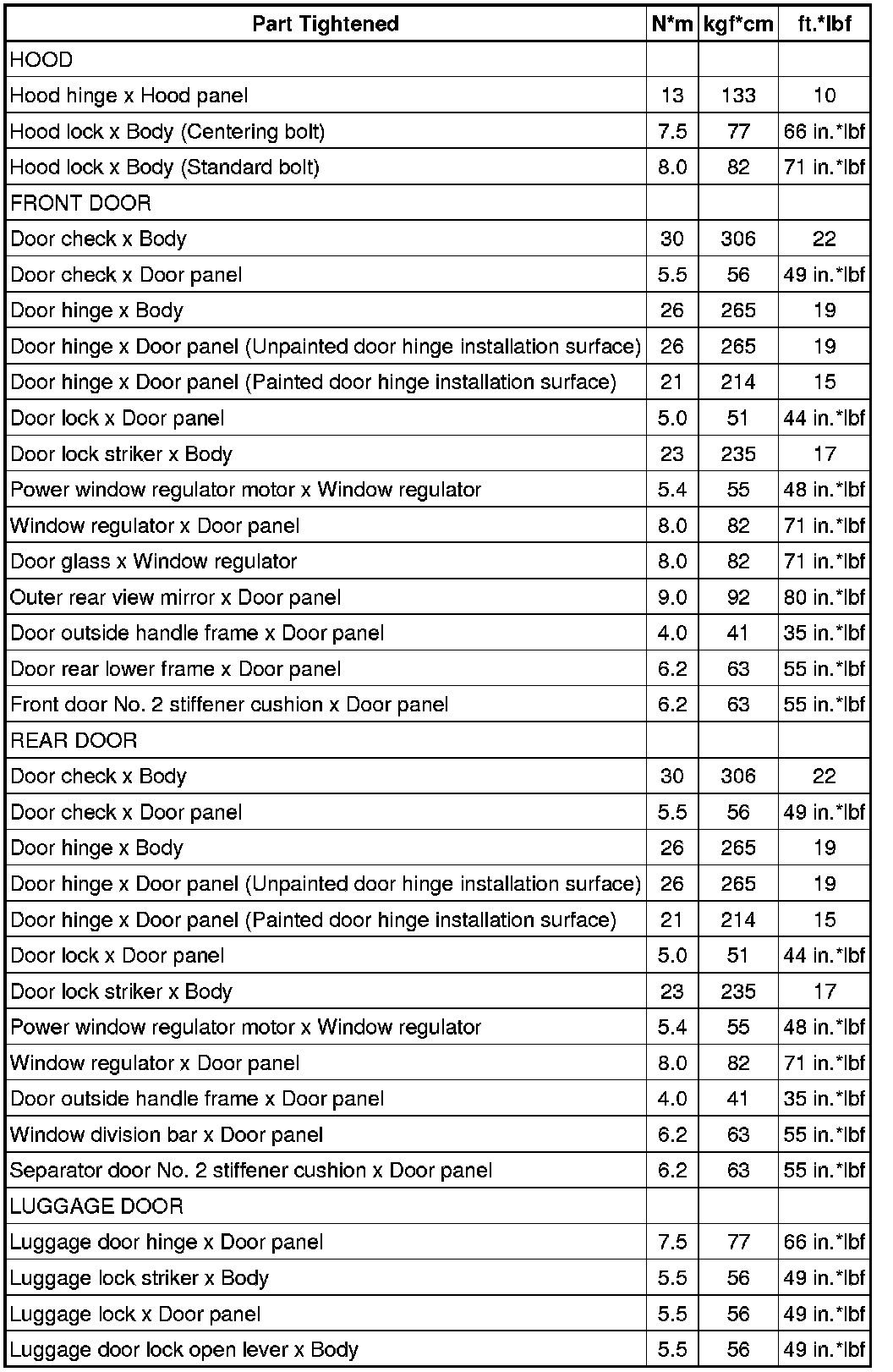 SPECIFICATIONS: DOOR / HATCH: TORQUE SPECIFICATIONS