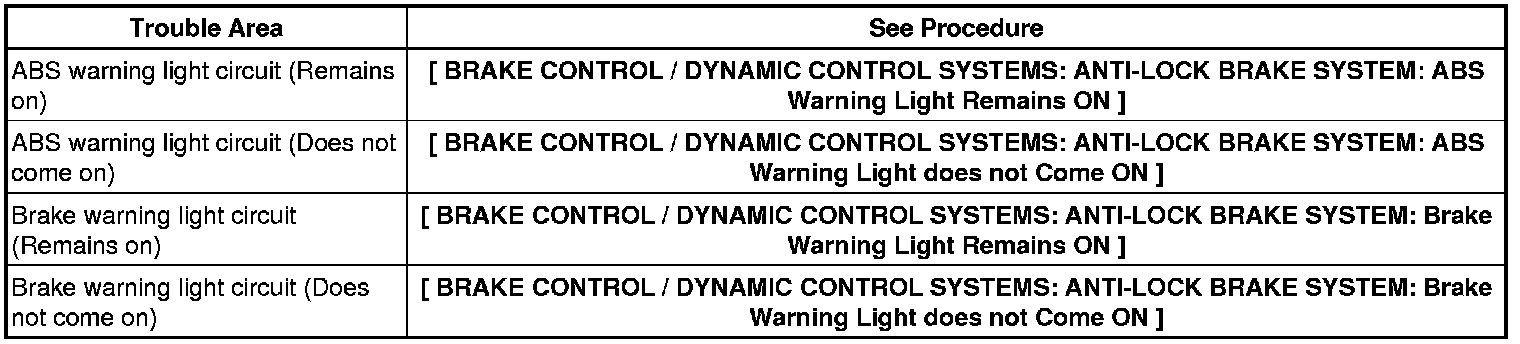 * If the skid control ECU stores any DTCs, the ABS warning and brake warning lights will come on.