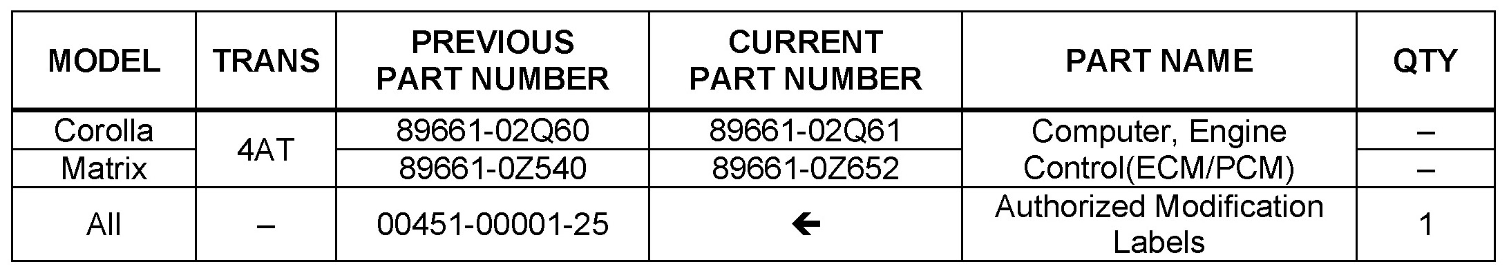 - Calibration ID(s) [Refer to the Calibration Identification Chart for the NEW CALIBRATION ID]