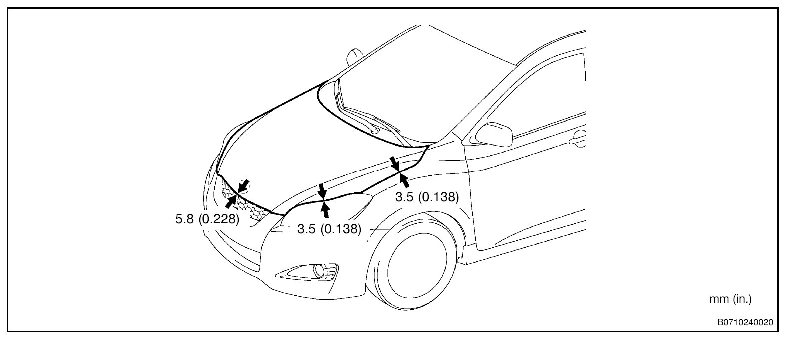b. Adjust the clearance between the hood and front fender by moving the hood.