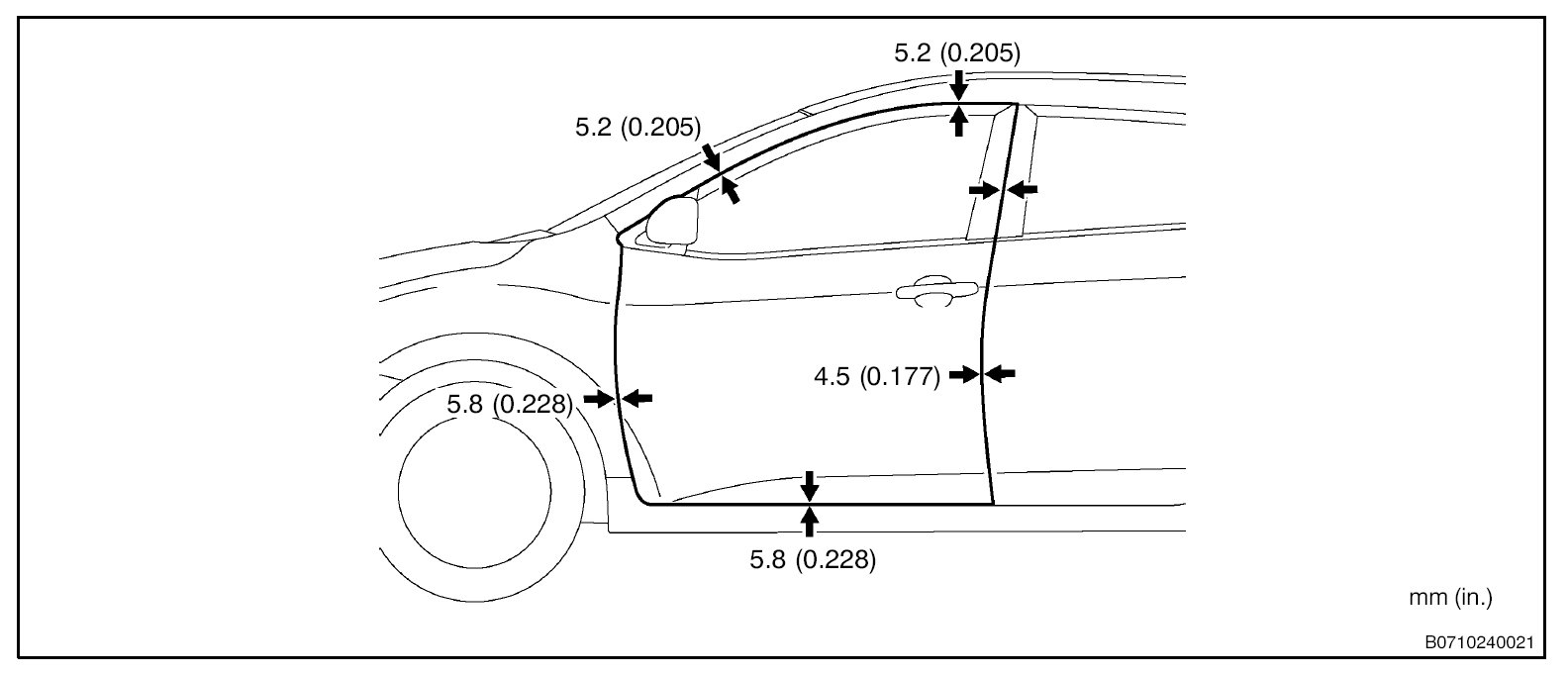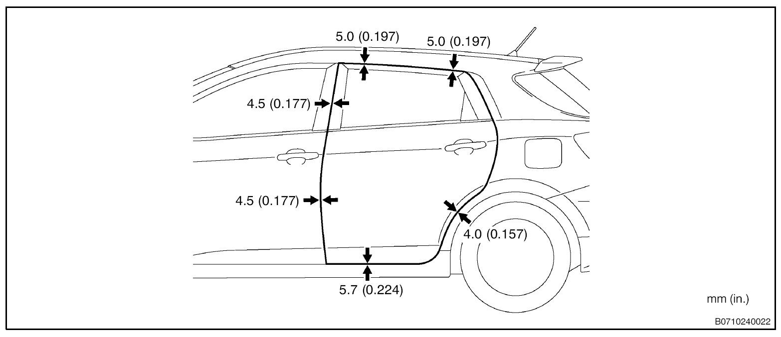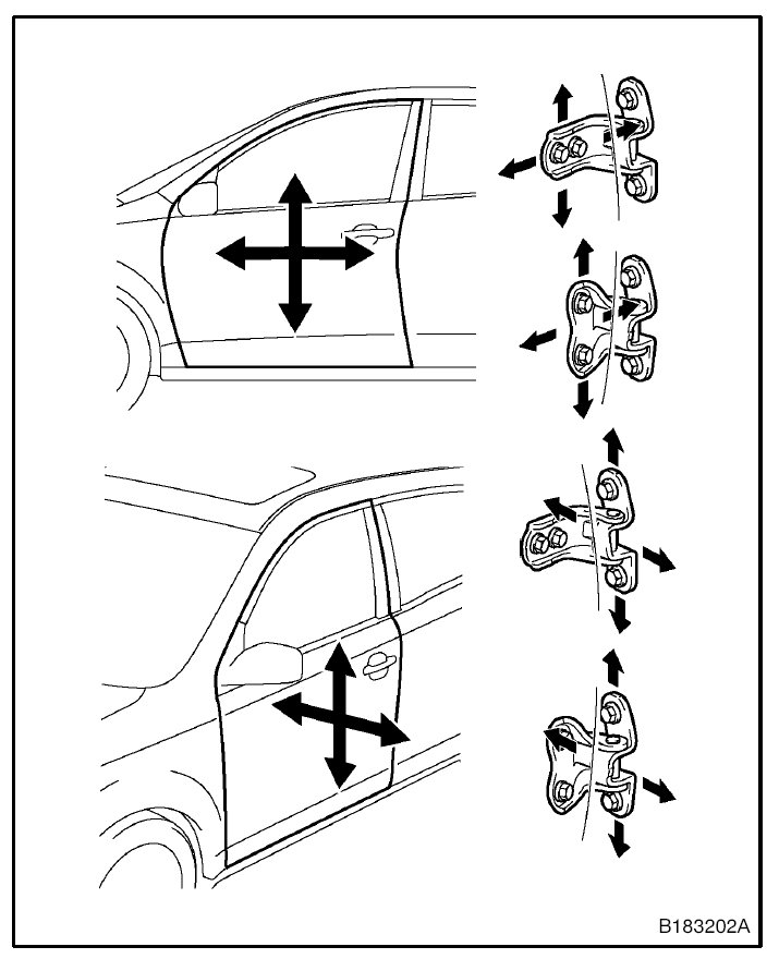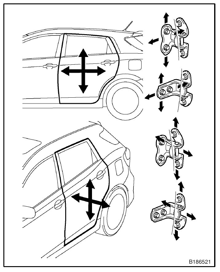 CAUTION: Before adjusting the door positions of vehicles equipped with side airbags and curtain shield airbags, be sure to disconnect the battery. After adjustment, inspect the SRS warning light, the side airbag system, and the curtain shield airbag system for normal operation. Then initialize both airbag systems.
