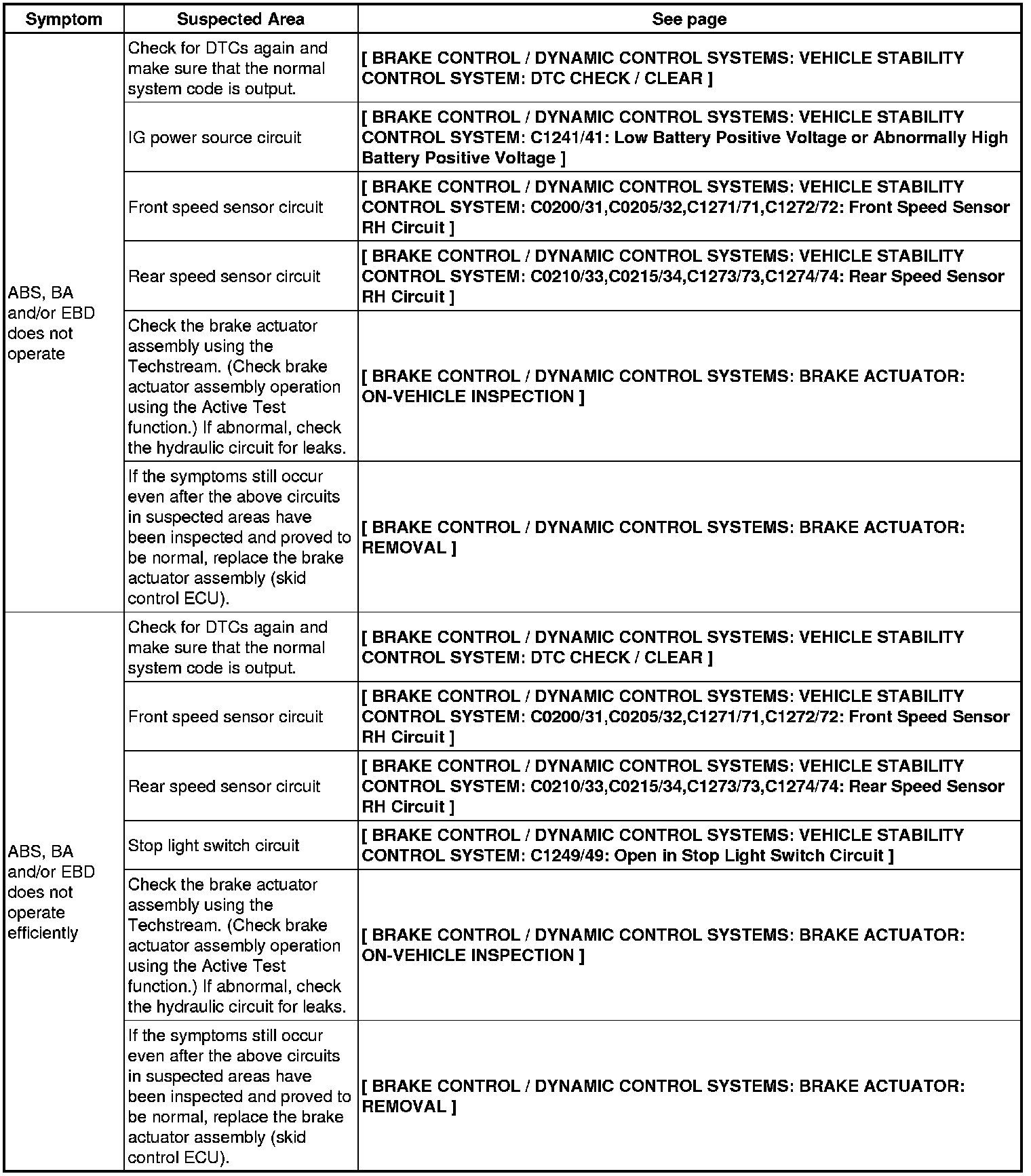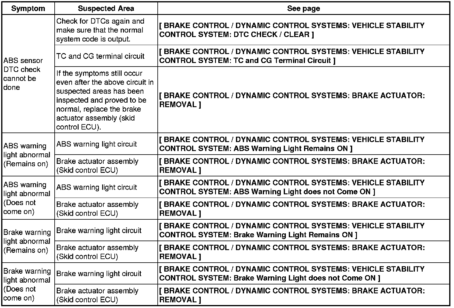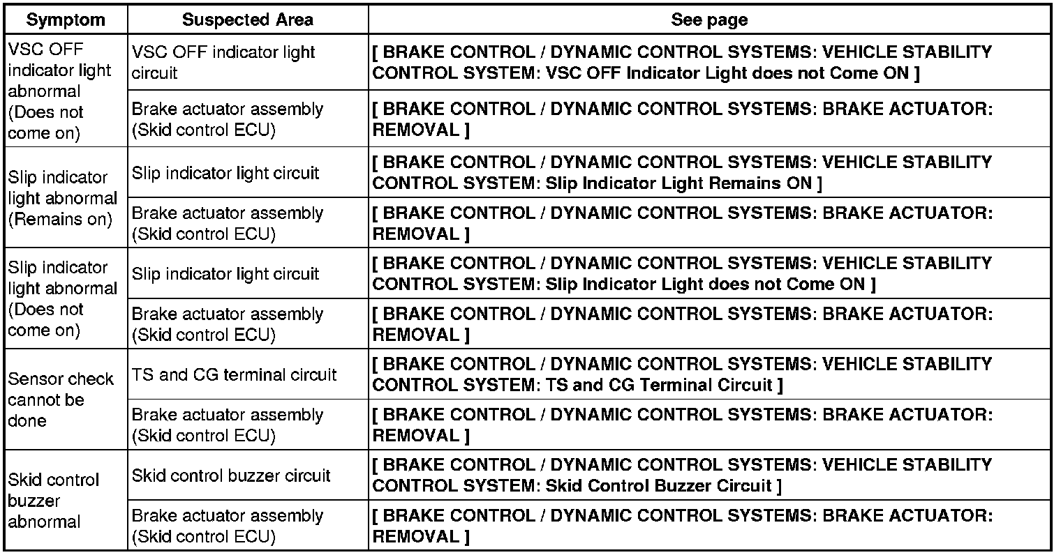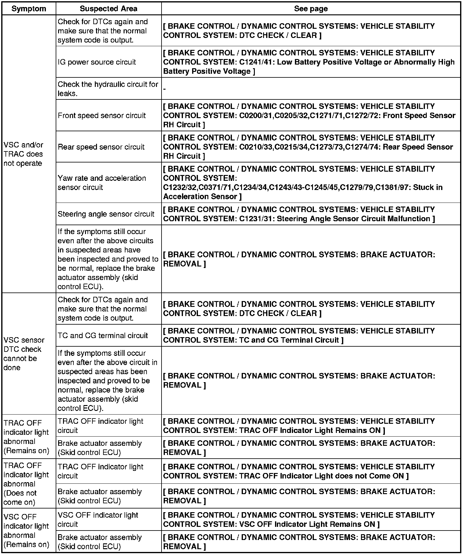 BRAKE CONTROL / DYNAMIC CONTROL SYSTEMS: VEHICLE STABILITY CONTROL SYSTEM (for 2AZ-FE): PROBLEM SYMPTOMS TABLE
