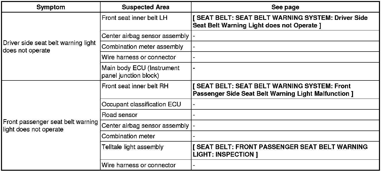 SEAT BELT: SEAT BELT WARNING SYSTEM: PROBLEM SYMPTOMS TABLE