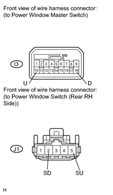 If the rear RH side manual UP / DOWN function does not operate, a malfunction may exist in the power window regulator motor, power window switch, power window master switch or wire harness.