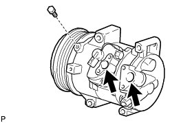 (a) When replacing the cooler compressor assembly with a new one, gradually discharge the inert gas (helium) from the service valve, and drain the following amount of oil from the vents indicated by the arrows in the illustration before installation.