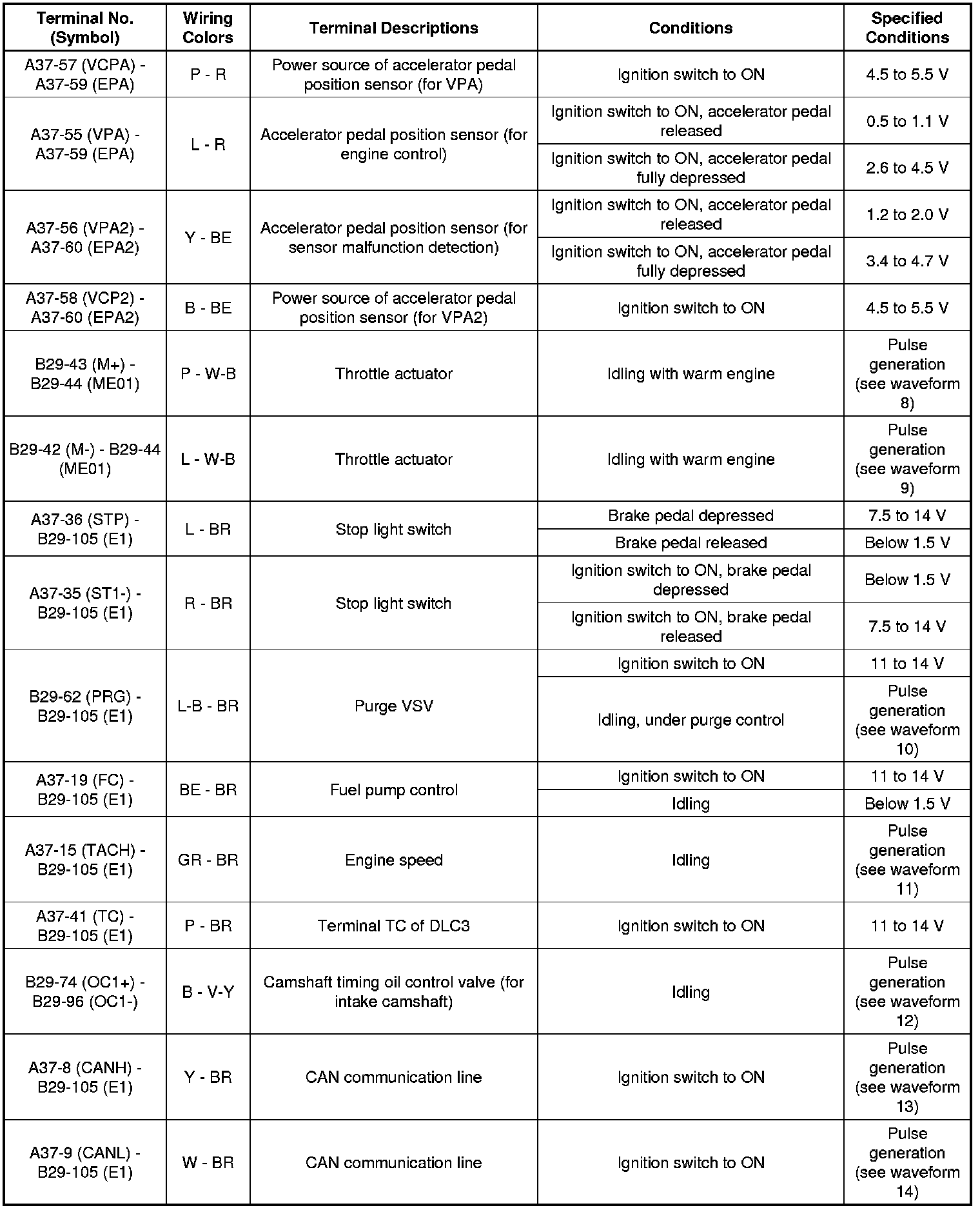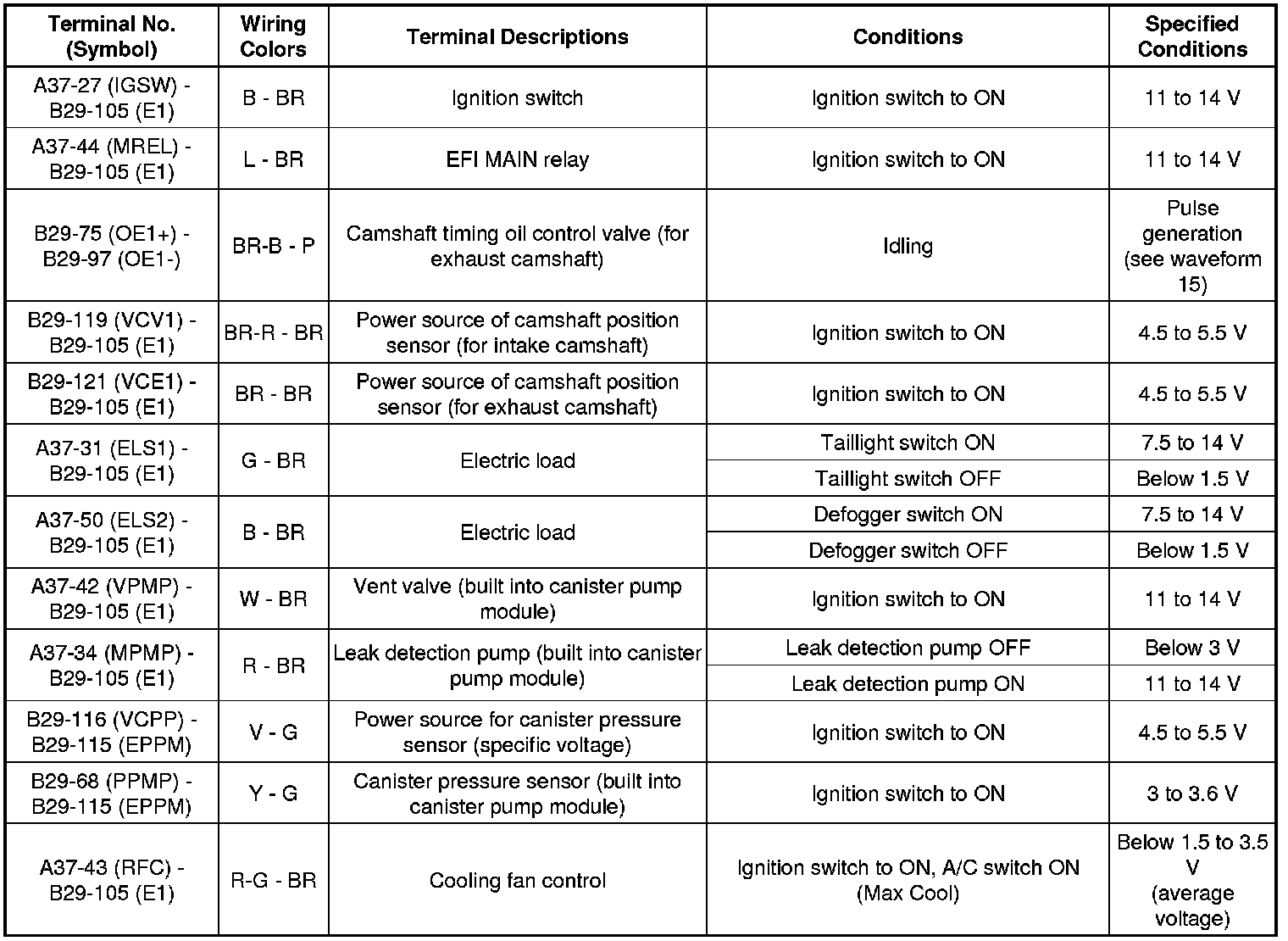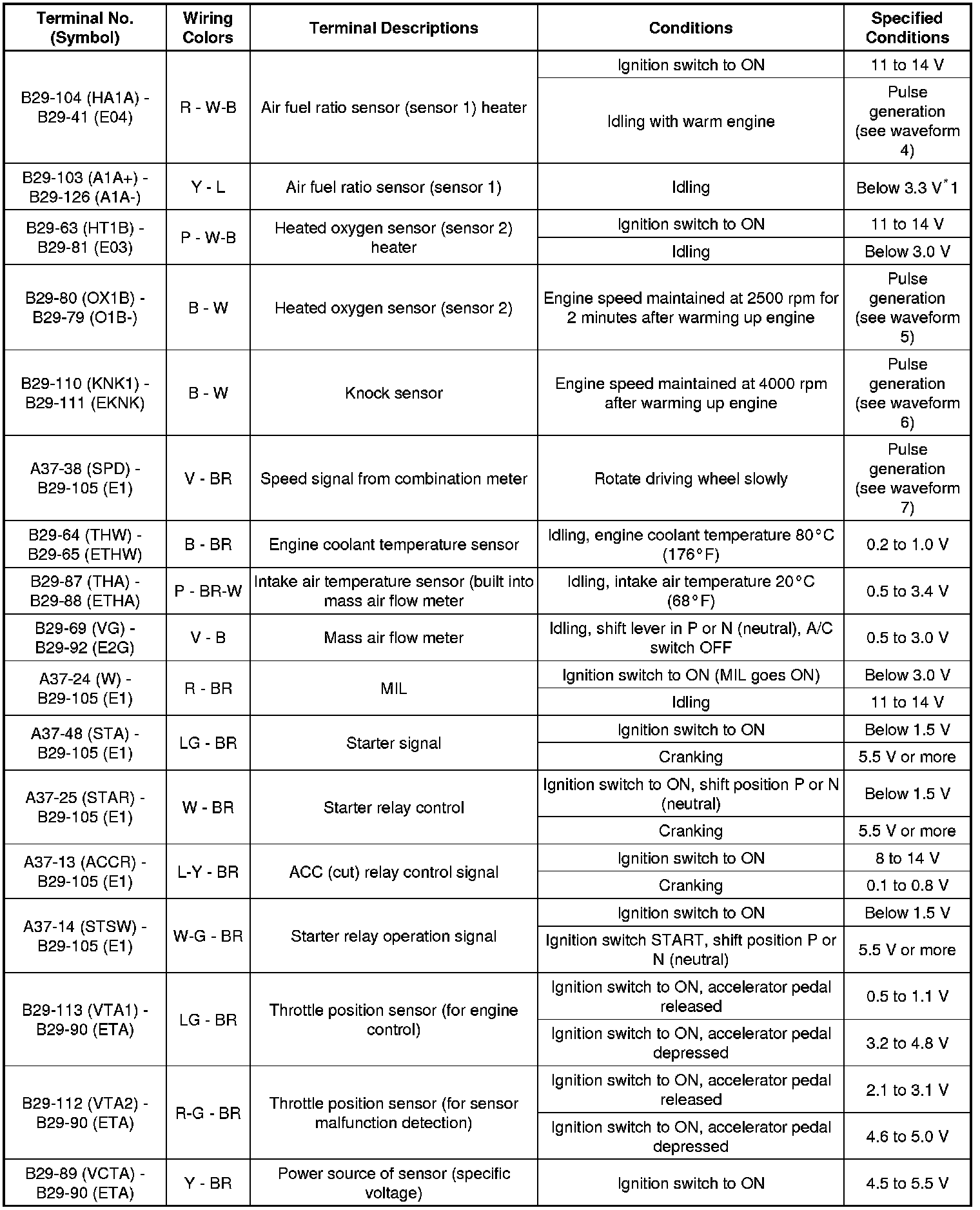 The standard normal voltage between each pair of the ECM terminals is shown in the table below. The appropriate conditions for checking each pair of the terminals are also indicated. The result of checks should be compared with the standard normal voltage for that pair of the terminals, and displayed in the "Specified Conditions" column. The illustration above can be used as a reference to identify the ECM terminal locations.
