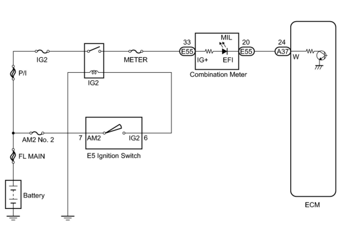 The MIL (Malfunction Indicator Lamp) is used to indicate vehicle malfunction detected by the ECM. When the ignition switch is turned to ON, power is supplied to the MIL circuit, and the ECM provides the circuit ground which illuminates the MIL.