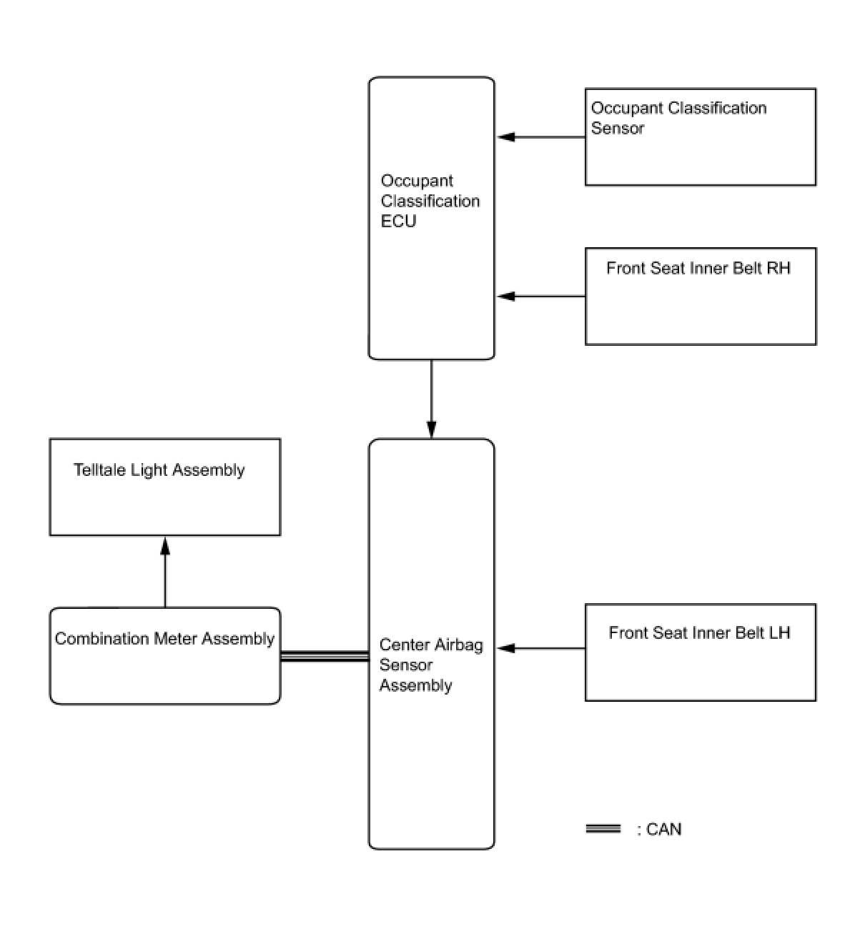 (a) When the driver seat belt is not fastened with the ignition switch ON, the driver seat belt warning light on the combination meter assembly comes on to inform the driver. The center airbag assembly detects the driver seat belt condition and sends signals to the body ECU and the meter assembly via CAN communication.