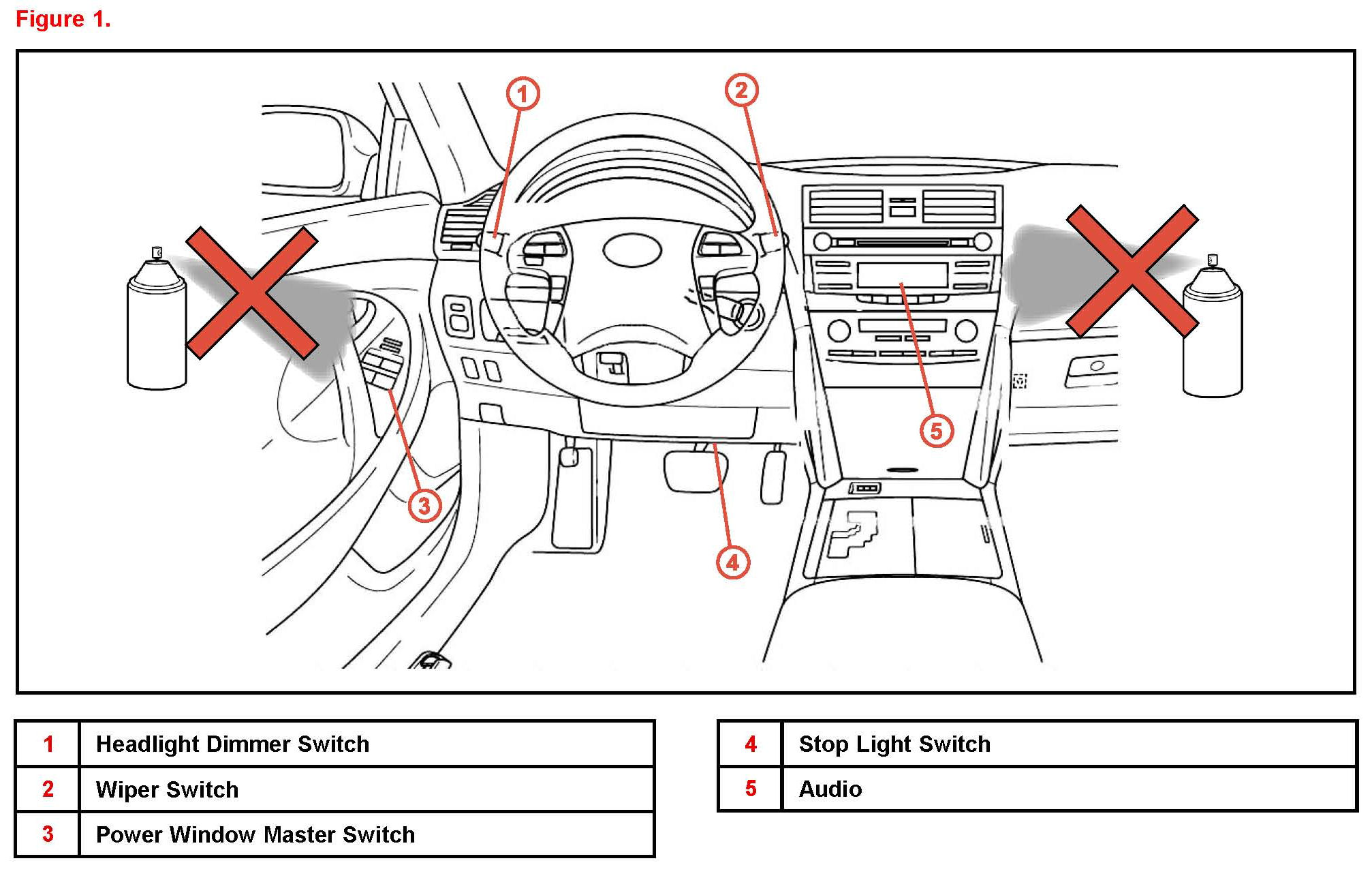 ^ DO NOT spray chemicals lubricants preservatives or cleaners directly onto into or in the vicinity of electrical components (i.e. brake light combination cruise door lock or window switches).