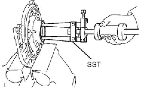 (a) Using SST, remove the front oil pump oil seal from the oil pump body.