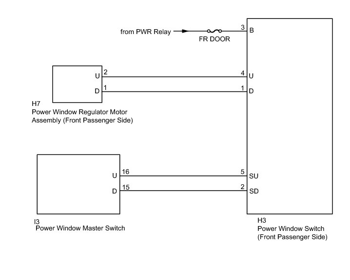 If the passenger side manual UP / DOWN function does not operate, a malfunction may exist in the power window regulator motor, power window switch, power window master switch or wire harness.