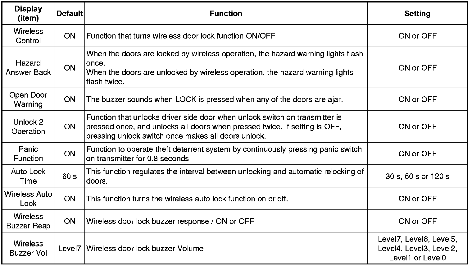 DOOR LOCK: WIRELESS DOOR LOCK CONTROL SYSTEM (w/o Smart Key System): CUSTOMIZE PARAMETERS