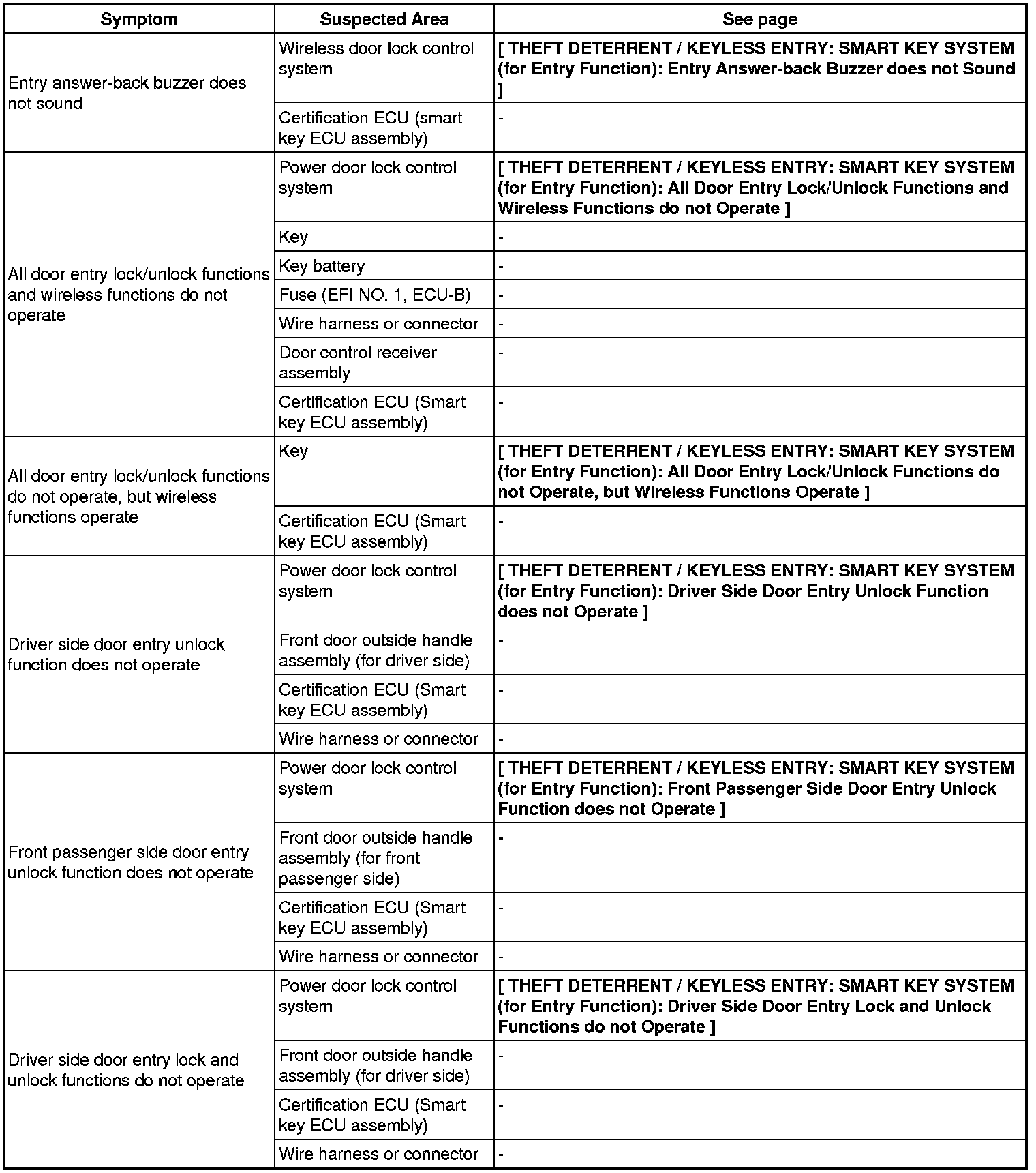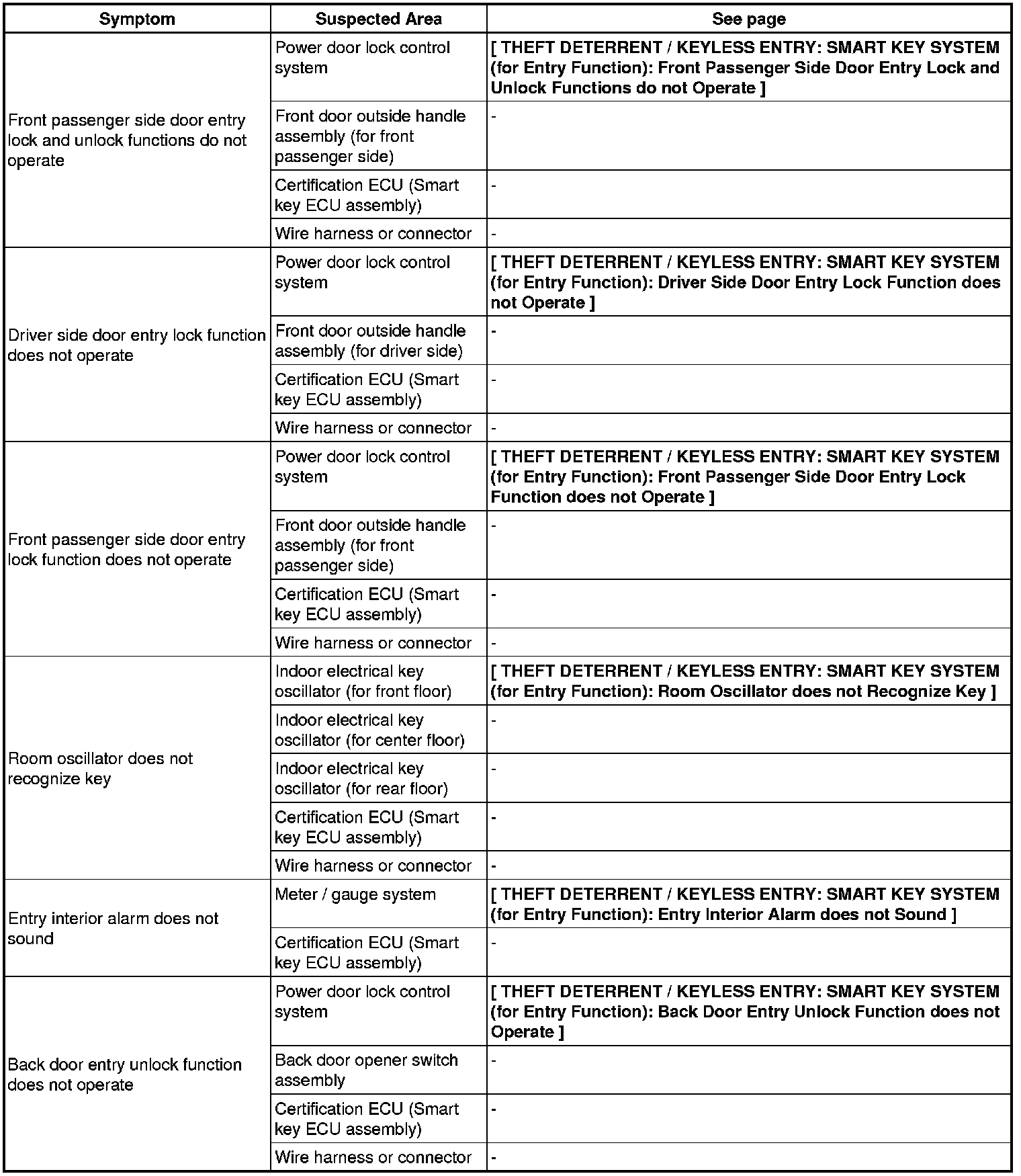 THEFT DETERRENT / KEYLESS ENTRY: SMART KEY SYSTEM (for Entry Function): PROBLEM SYMPTOMS TABLE
