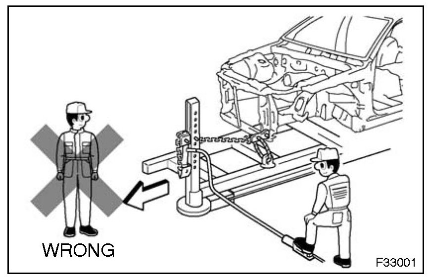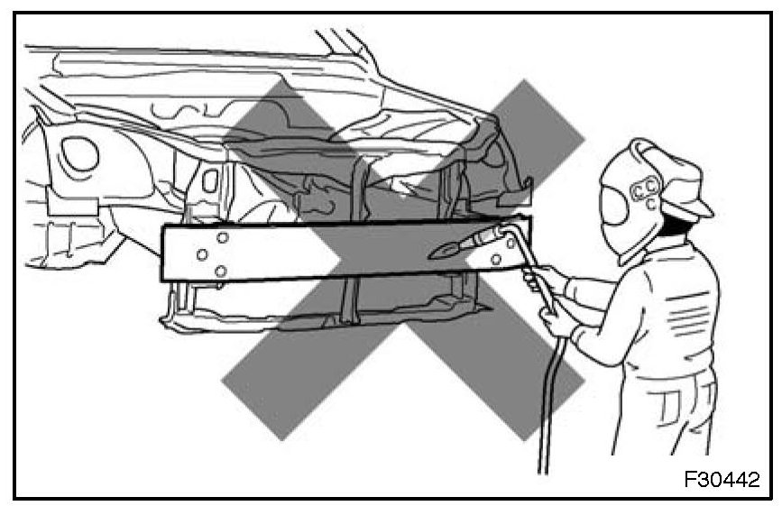 1. Rustproof high strength steel sheets are used for the body frame. Therefore, if these parts are heat repaired using an acetylene torch or equivalent, the crystalline structure changes, causing the strength of the steel sheets to decrease. Also, the zinc coating which is used to protect the body from rust will be damaged. This causes the surface of the steel sheets to become oxidized, which reduces their ability to resist rust.