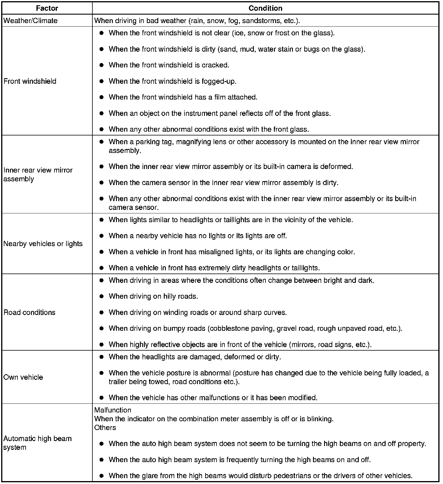 (b) Conditions Unsuitable for Using Automatic High Beam System