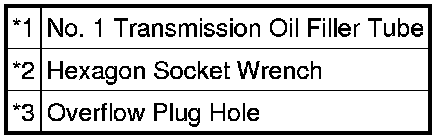 * If ATF comes out, it is not necessary to perform the initial filling procedure. After checking the tightening torque of the No. 1 transmission oil filler tube, temporarily tighten the overflow plug.